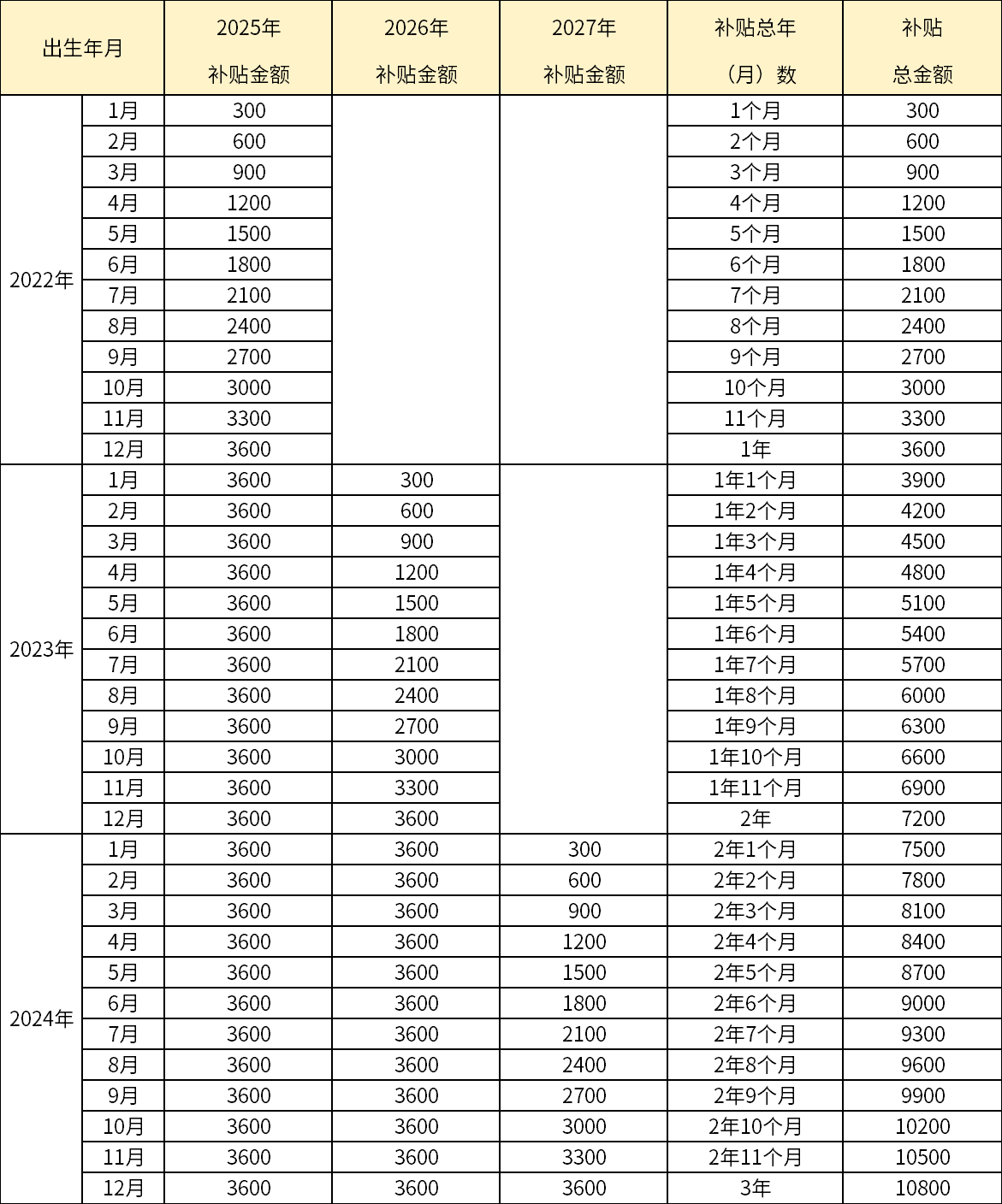 育兒補(bǔ)貼金額對照表
