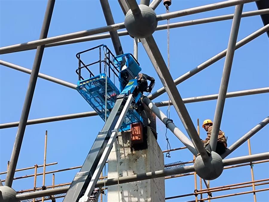 項目部嚴(yán)格落實好節(jié)后復(fù)工復(fù)產(chǎn)“六個一”,全面排查網(wǎng)架班組施工安全隱患,對施工設(shè)備、作業(yè)人員、安全防護(hù)設(shè)施等進(jìn)行檢查和培訓(xùn),確保設(shè)備設(shè)施安全可靠后全面復(fù)工。目前,該項目正在進(jìn)行網(wǎng)架小立柱的安裝和提升架的拆除工作。