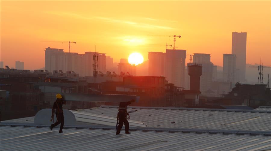 7月25日清晨,在廣西柳州柳工集團柳工裝載機燈塔工廠項目工地,工人在屋面施工。