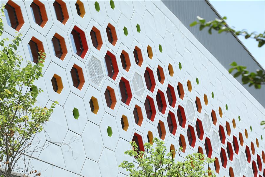 項目建筑外立面設(shè)計將柳州本土文化元素“紫荊花”與康恒公司“蜂巢”理念完美融合,多層次的幕墻肌理協(xié)同自然光線,在不同照射條件下呈現(xiàn)出多樣的光影效果,不僅呼應(yīng)了垃圾焚燒發(fā)電精細(xì)的工藝流程,更體現(xiàn)了人與自然和諧共生的美好愿景。
