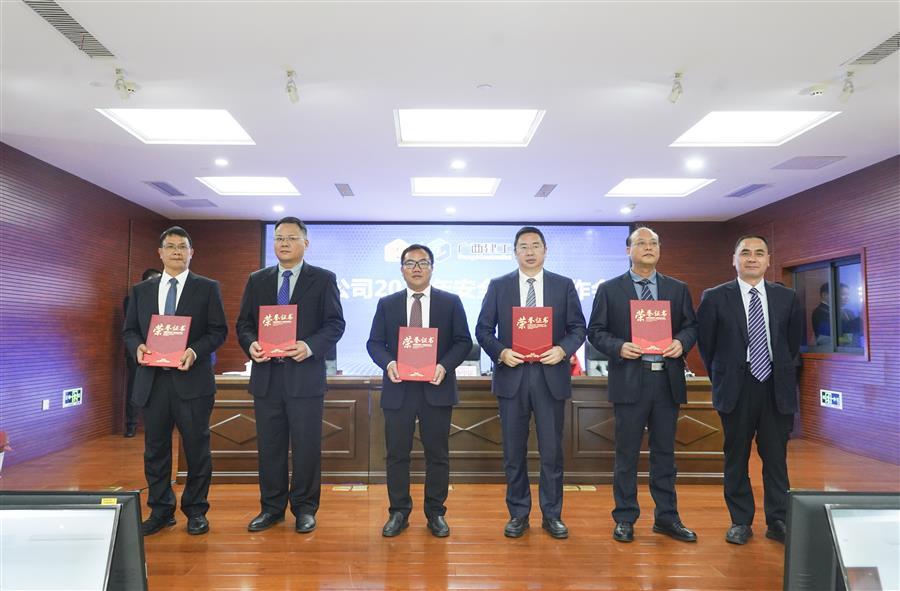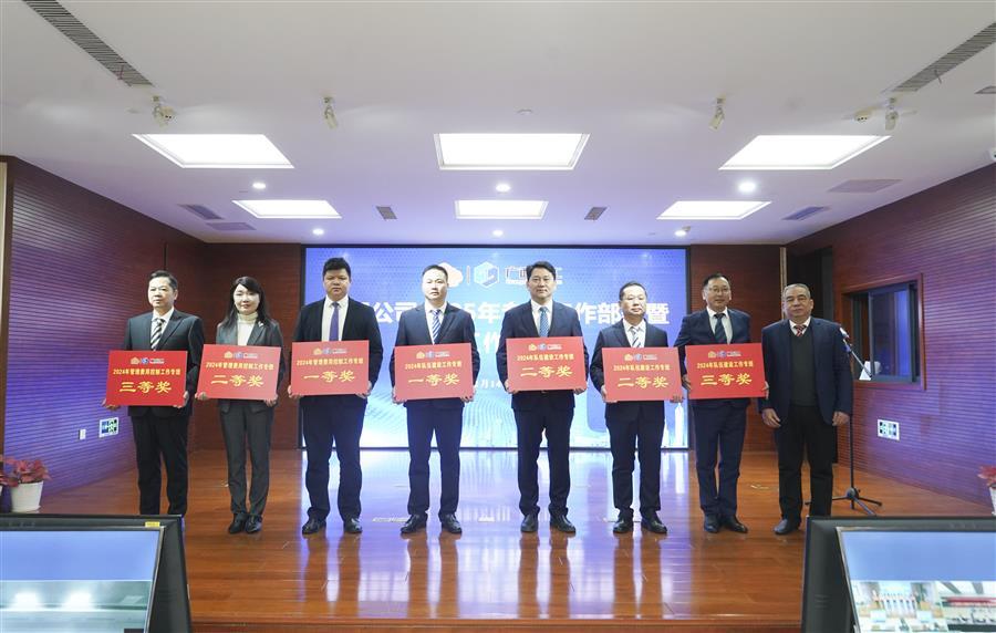 公司董事長、黨委書記覃振華(右三)上臺領(lǐng)取2024年隊伍建設(shè)工作專班獎,公司總經(jīng)理、黨委副書記蒙勝益(左一)上臺領(lǐng)取2024年管理費用控制工作專班獎