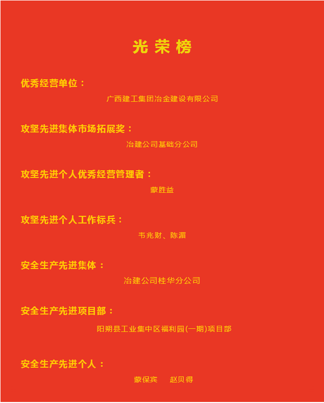成績來之不易,榮譽催人奮進。回首2024年,在集團公司的正確領(lǐng)導下,冶建公司上下一心、團結(jié)一致,奮力拼搏、積極作為,以“三大攻堅戰(zhàn)”為工作重點,努力提升老賽道、開辟新賽道,在破局突圍、生存發(fā)展上取得了一定成效,確保企業(yè)發(fā)展平穩(wěn)大局穩(wěn)定。全年新簽合同額、營業(yè)收入、項目總回款三項主要指標排在集團公司的前三位,殊為不易。展望未來,冶建公司將堅定發(fā)展信心,全力以赴抓經(jīng)營,爭取承接更多優(yōu)質(zhì)項目;新老賽道齊發(fā)力,整合資源拓市場提業(yè)績;狠抓安全促生產(chǎn)沖產(chǎn)值;強化管理保運營促發(fā)展;加強清收爭取更多資金回籠;轉(zhuǎn)變工作作風,以上率下、形成合力,真抓實干,把各項工作抓細抓實抓出成效,助力集團公司實現(xiàn)恢復性增長。