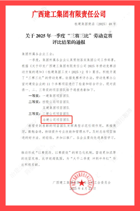 4月23日,集團(tuán)公司工會通報2025年一季度“三賽三比”勞動競賽評比結(jié)果,冶建公司項目團(tuán)隊在11個建安企業(yè)參賽項目中榮獲三等獎,彰顯了項目團(tuán)隊務(wù)實(shí)高效、團(tuán)結(jié)協(xié)作、拼搏進(jìn)取的精神風(fēng)貌。