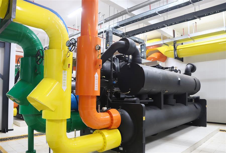 空調(diào)機(jī)房設(shè)備排布成排成行,空間合理,管線采用落地式共用管架。