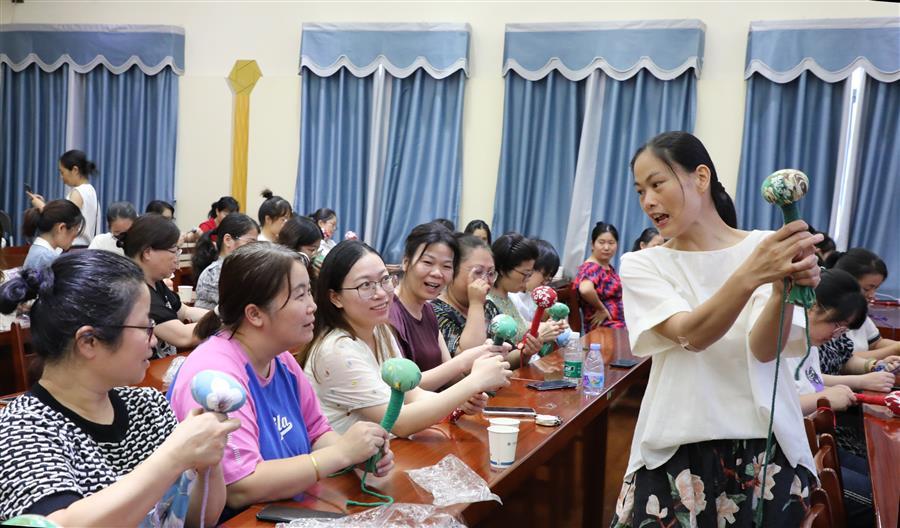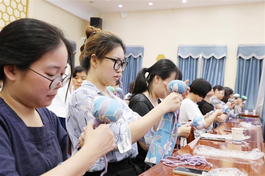 課堂上,培訓老師王春梅為大家詳細講解了艾草養(yǎng)生錘的功效和用途,并演示了其制作方法和步驟。“將錘柄插入艾草包,拉緊艾草包,然后將其放在布料三分之一處,捏成一個緊實的圓球……”在王老師的指導下,女職工們積極參與,跟著老師的指導一步一步地制作自己的養(yǎng)生艾草錘。大家認真細致的聽講并按步驟制作,不久一把把色彩鮮艷、質(zhì)量上乘的艾草養(yǎng)生錘相繼“出爐”。大家互相試用,現(xiàn)場洋溢著歡聲笑語。